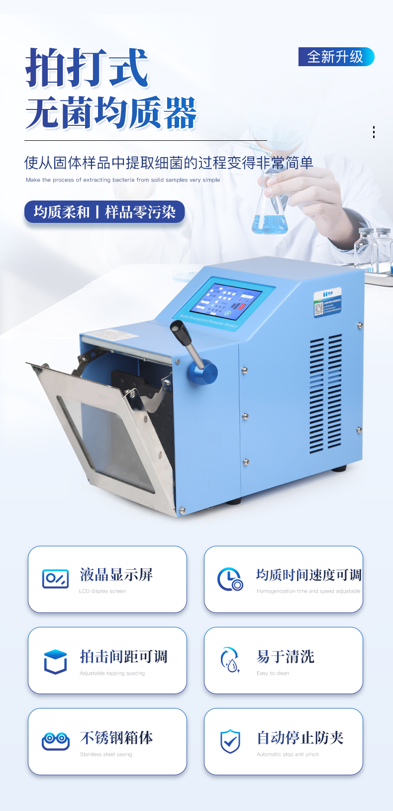 ●5英寸液晶顯示屏。 ●可儲存三組工作程序。 ●可調整的均質時間。 ●均質速度可調節或固定。 ●拍擊器可調整前后距離。 ●無菌一次性濾袋,保證衛生。 ●全開啟式門,易于清洗。 ●玻璃透明窗口易于觀察 。 ●樣品與均質儀無接觸,如無樣品泄露則不需進行系統清洗. ●均質柔和、樣品零污染、無損傷、不升溫、不需要滅菌處理,不需洗刷器皿。