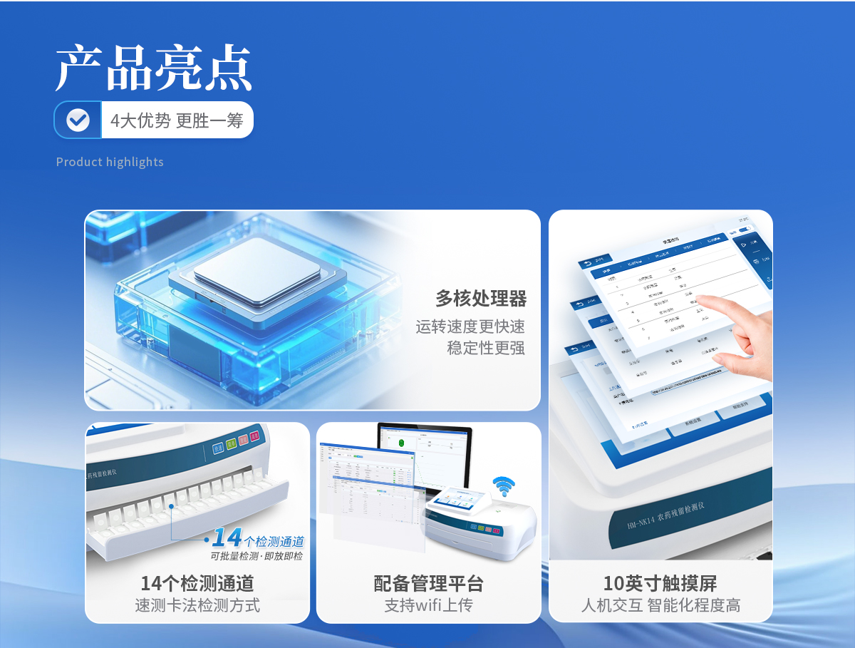 1、★采用速測卡法,省卻冗雜的步驟,提高檢測體驗和效率 2、安卓智能系統7.1版本,操作更加流暢,使用更方便。 3、★10英寸高靈敏真彩觸摸屏顯示,交互性用戶體驗更好。 4、★具有14個檢測卡通道,可更多的批量測試樣品,即放即檢,檢測效率更高。 5、支持wifi、藍牙傳輸,數據可無線上傳;支持U盤拷貝數據,免驅動插拔。 6、配置食品安全管理平臺,檢測結果可長期存儲,進行長短期查看分析,輔助管理。 7、儀器具有分類管理蔬菜名稱菜單庫,并可按需編輯蔬菜名稱、檢測單位等信息。 8、內置熱敏打印機,可選擇性打印詳細的檢測信息。 9、★檢測過程中檢測倉自動彈出,自動關閉。 10、主控采用多核處理器,主頻1.88Ghz,運轉速度更快速,穩定性更強。