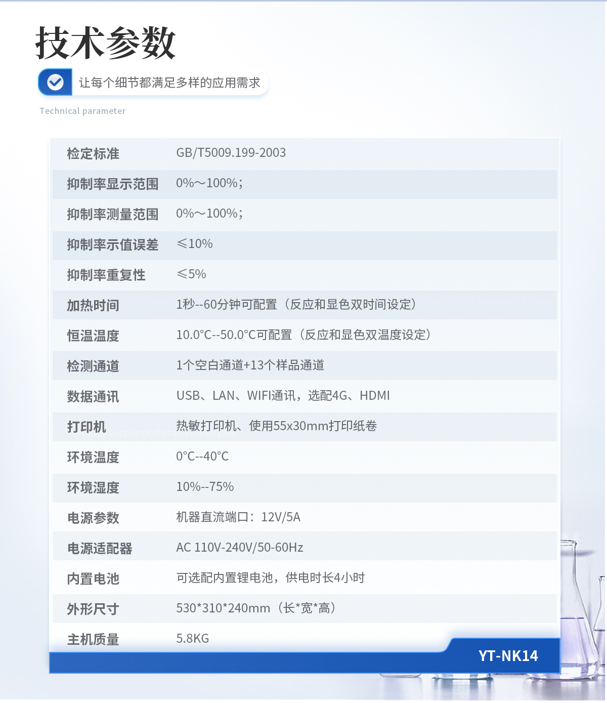 檢定標準:GB/T5009.199-2003 抑制率顯示范圍:0%~100%; 抑制率測量范圍:0%~100%; 抑制率示值誤差:≤10% 抑制率重復性:≤5% 加熱時間:1秒--60分鐘可配置(反應和顯色雙時間設定) 恒溫溫度:10.0℃--50.0℃可配置(反應和顯色雙溫度設定) 檢測通道:1個空白通道+13個樣品通道 數據通訊:USB、LAN、WIFI通訊,選配4G、HDMI 打印機:熱敏打印機、使用55x30mm打印紙卷 環境溫度:0℃--40℃ 環境濕度:10%--75% 電源參數:機器直流端口:12V/5A 電源適配器:AC 110V-240V/50-60Hz 內置電池:可選配內置鋰電池,供電時長4小時 外形尺寸:530*310*240mm(長*寬*高) 主機質量:5.8KG