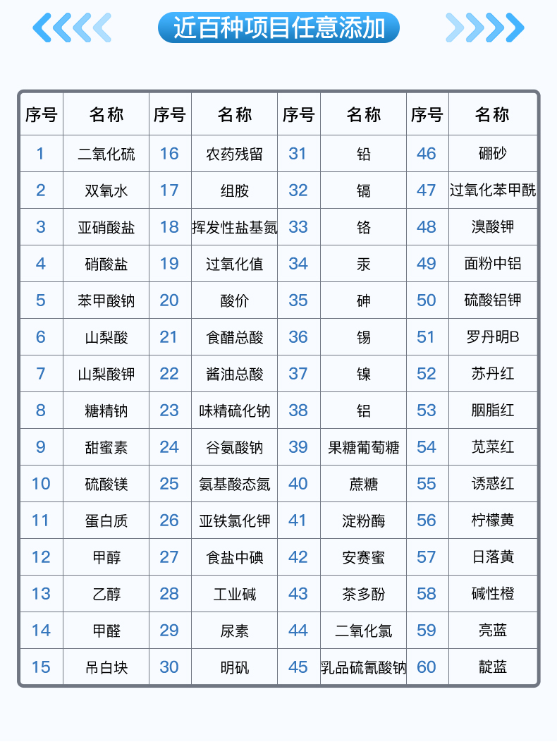 可快速檢測各類食品中的甲醛、吊白塊、二氧化硫、亞硝酸鹽、雙氧水、硼砂、農藥殘留、乳及乳制品中蛋白質、硝酸鹽、重金屬鉛的含量,儀器預留其他項目檢測程序和端口,根據日后需求可方便的自主增加檢測項目。