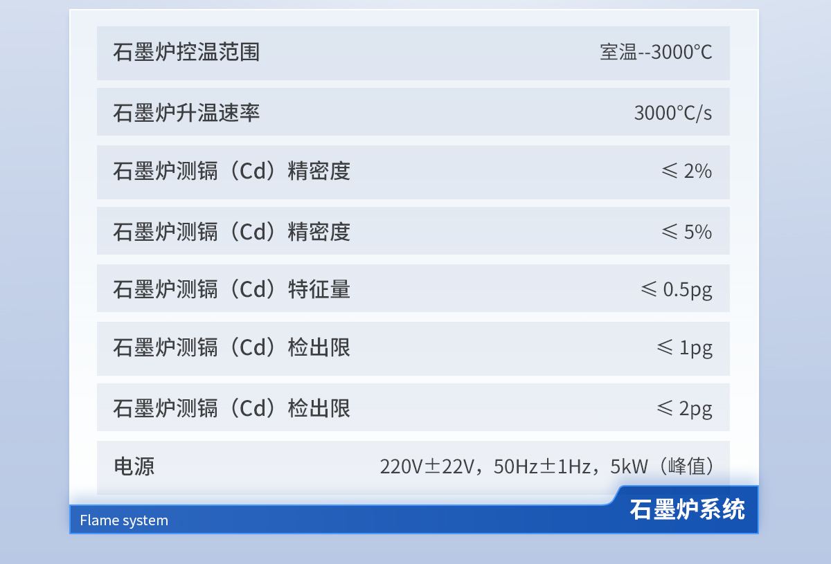 整機(jī)單色器類型:切爾尼-特納型(Czerny-Turner) 波長(zhǎng)范圍:190nm~900nm 波長(zhǎng)準(zhǔn)確度:±0.25nm 波長(zhǎng)重復(fù)性:< 0.05nm 光譜帶寬:0.1/0.2/0.4/0.7/1.4 nm 五檔自動(dòng)切換 火焰系統(tǒng) 精密度:< 0.8%(火焰法測(cè)銅) 檢出限:< 0.008ug/mL 特征濃度:< 0.025μg/ml/1%(火焰法測(cè)銅) 靜態(tài)穩(wěn)定性: 0.003 Abs(static) 動(dòng)態(tài)穩(wěn)定性: 0.004 Abs(dynamic) 石墨爐系統(tǒng) 石墨爐控溫范圍:室溫--3000℃ 石墨爐升溫速率:3000℃/s 石墨爐測(cè)鎘(Cd)精密度:≤ 2% 石墨爐測(cè)鎘(Cd)精密度:≤ 5% 石墨爐測(cè)鎘(Cd)特征量:≤ 0.5pg 石墨爐測(cè)鎘(Cd)檢出限:≤ 1pg 石墨爐測(cè)鎘(Cd)檢出限:≤ 2pg 電源:220V±22V,50Hz±1Hz,5kW(峰值)