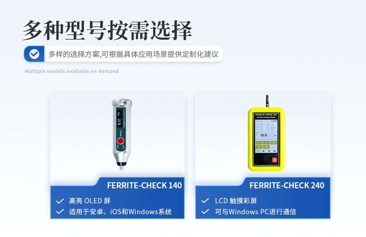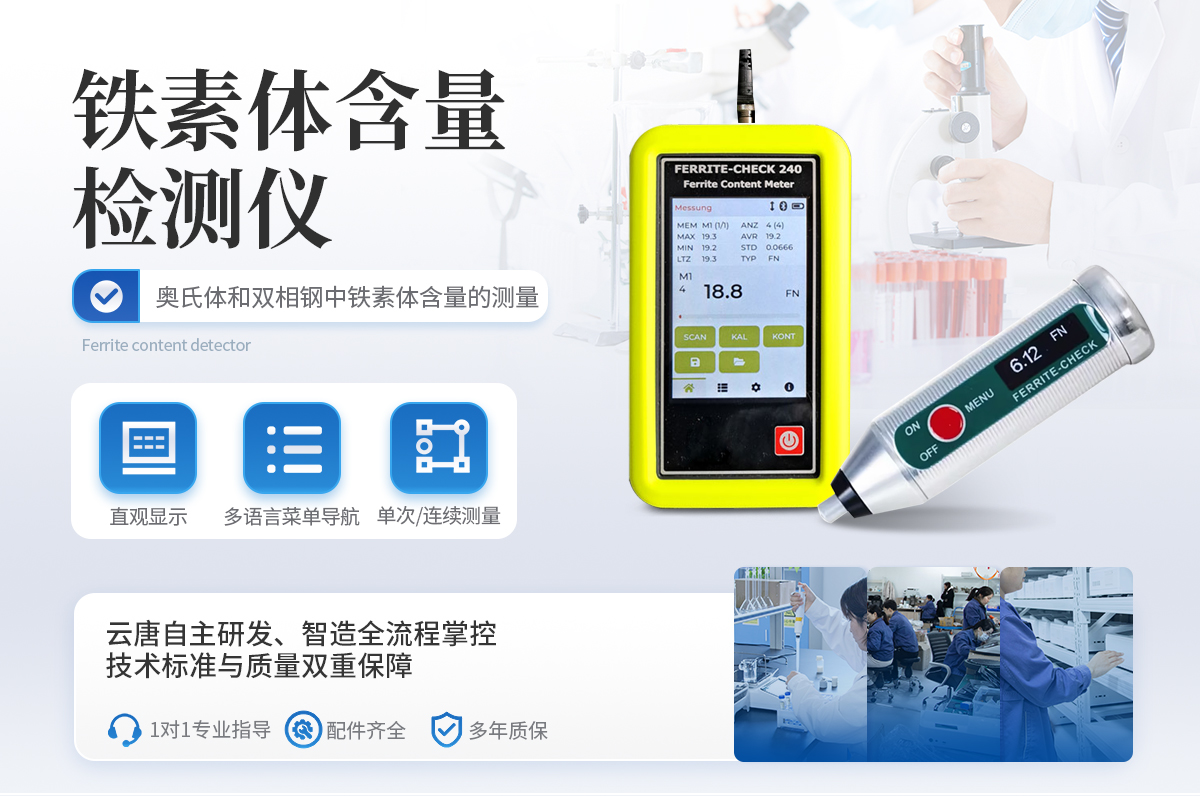 產品描述:儀器介紹:鐵素體含量檢測儀Ferrite content meter;制造商:德國李斯特(List-Magnetik)性能特點:操作簡單FERRITE-CHECK 240鐵素體含量檢測儀采用分體式的設計,使用方便,儀器符合Basel標準DIN EN ISO 8249,使用磁感應法測量奧氏體鋼和雙相鋼中的鐵素體含量。 全新測頭高采樣率,測頭的信號全部數字化,以實【詳情】  更新時間:2026-04-08