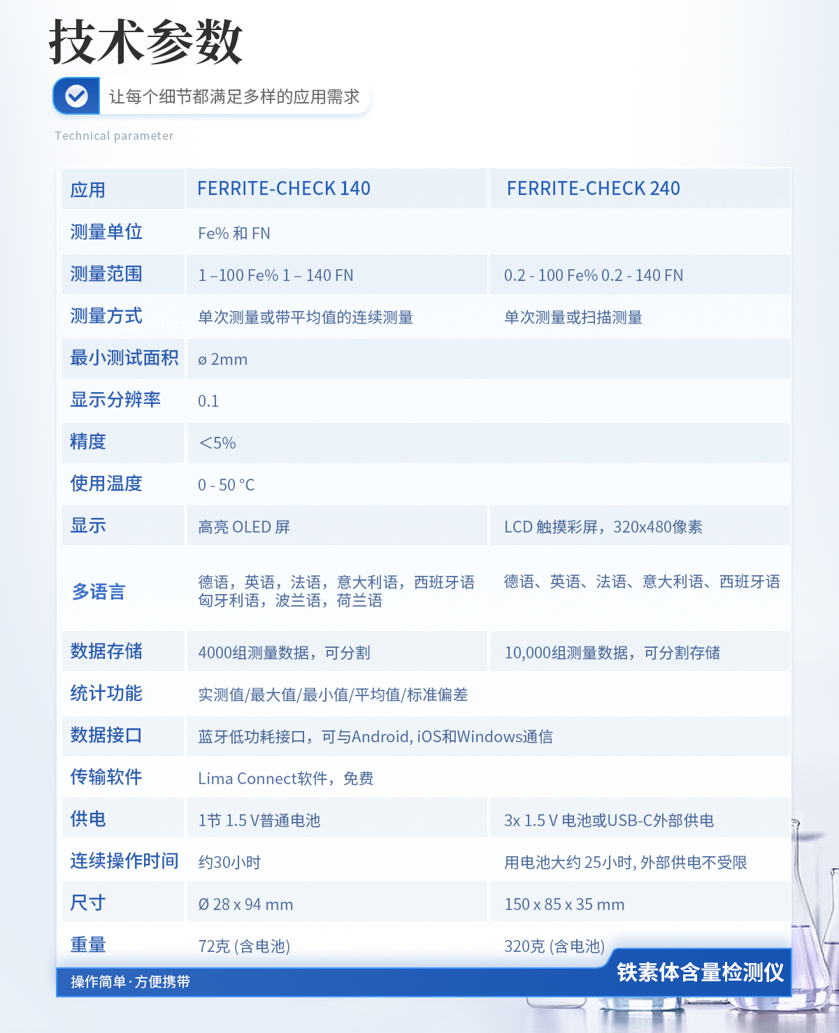 FERRITE-CHECK 240鐵素體含量檢測儀采用分體式的設計,使用方便,儀器符合Basel標準DIN EN ISO 8249,使用磁感應法測量奧氏體鋼和雙相鋼中的鐵素體含量。 全新測頭