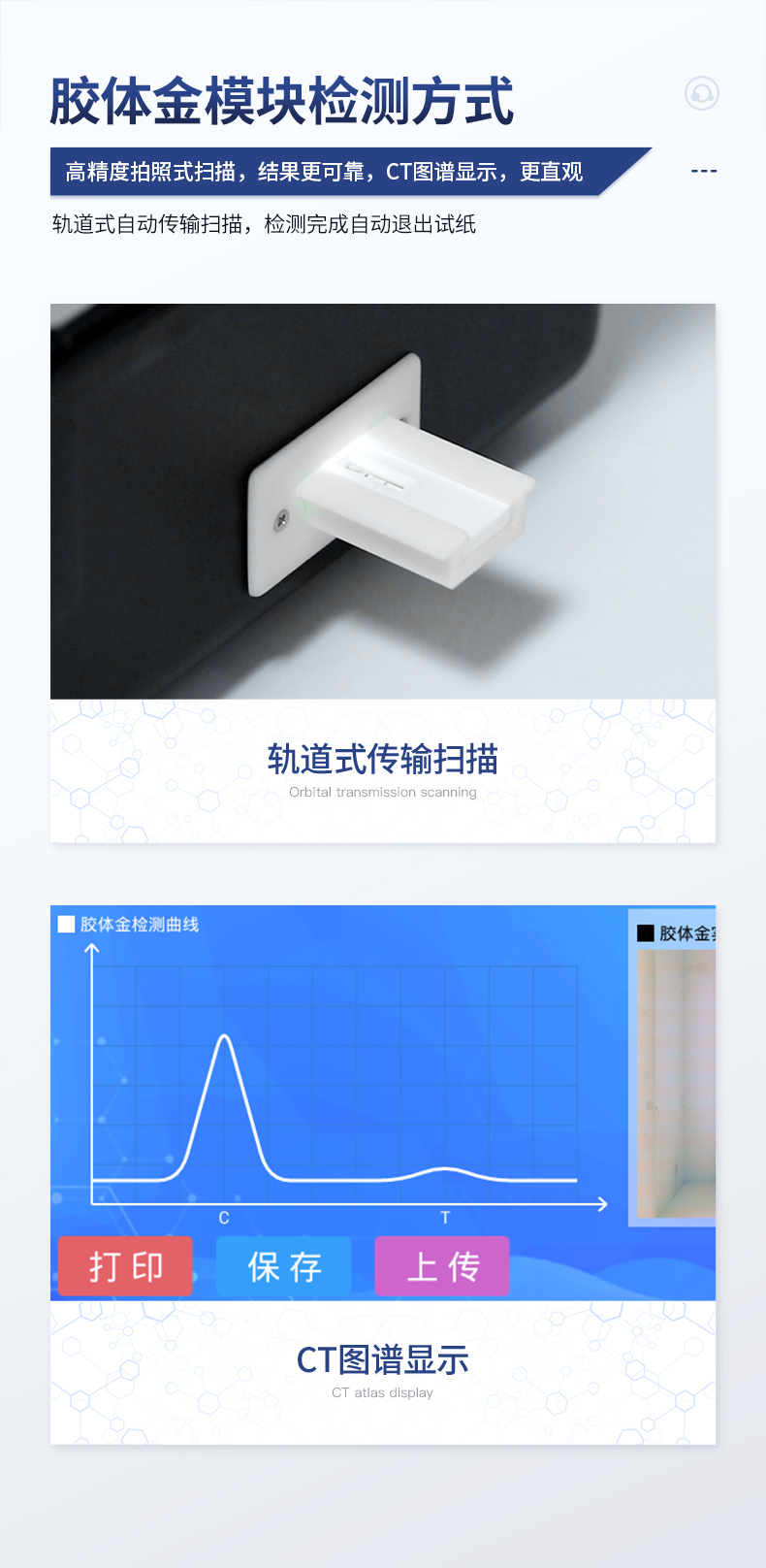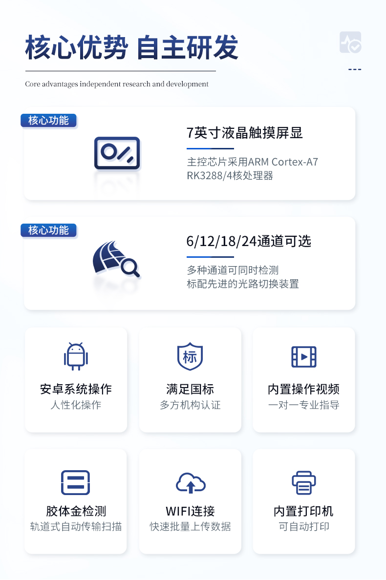 | 安卓智能操作系統,采用更加**的UI交互界面,儀器具有wifi聯網上傳、4G聯網傳輸、GPRS無線遠傳、網線連接功能,快速批量上傳數據。 | 智能化程度高,儀器具有自檢功能:具有開機自檢和調零功能,具有自動檢測重復性功能。 | 新一代高速熱敏打印機,檢測完成可自動打印或批量打印檢測報告和二維碼。 | 儀器帶有監管平臺,數據可局域網和互聯網數據上傳,檢測結果直接傳至食品安全監管平臺。進行區域食品安全監管及大數據分析處理與數據統計,檢測區域食品安全長短期動態,達到食品安全問題預估、預警 | 一體化主機,包含食品安全檢測模塊、多通道農藥殘留檢測模塊、膠體金免疫層析檢測模塊。 | 一體化便攜式快檢設備,滿足現場及流動檢測使用需求,能夠在同一軟件下實現所有檢測項目的檢測,并可通過同一窗口直觀顯示檢測結果。 | 膠體金模塊檢測方式:軌道式自動傳輸掃描,檢測完成后自動退出檢測卡。 | 食品安全檢測儀CT線自動識別,無需手動調整,檢測完成自動顯示CT坐標曲線。 | 內置強大的數據庫,具有多品類多種類樣品菜單功能,可靈活選擇檢測樣品,不同的檢測通道可同時檢測不同的樣品項目。也可在儀器上直接編輯錄入樣品名稱、檢測指標、送檢單位等信息并保存進樣品數據庫。 | 產品內置操作演示視頻,是您身邊的化驗指導專家。 | 樣品處理簡單省力,整體操作快速、安全、便捷。 | 儀器具有自身保護功能,可設置用戶名及密碼,防止非工作人員操作等。 | 高靈敏度,高檢測精度,高重復性精度,掃描式高精度光學傳感器。 | 結果判定線可修改,對照值標定值可保存,斷電不丟失數據。 | 兼容市場上所有的膠體金卡,使用耗材不受限制,極大增強用戶使用體驗。 | 儀器具有重新校準、鎖定、恢復出廠設置功能。 |