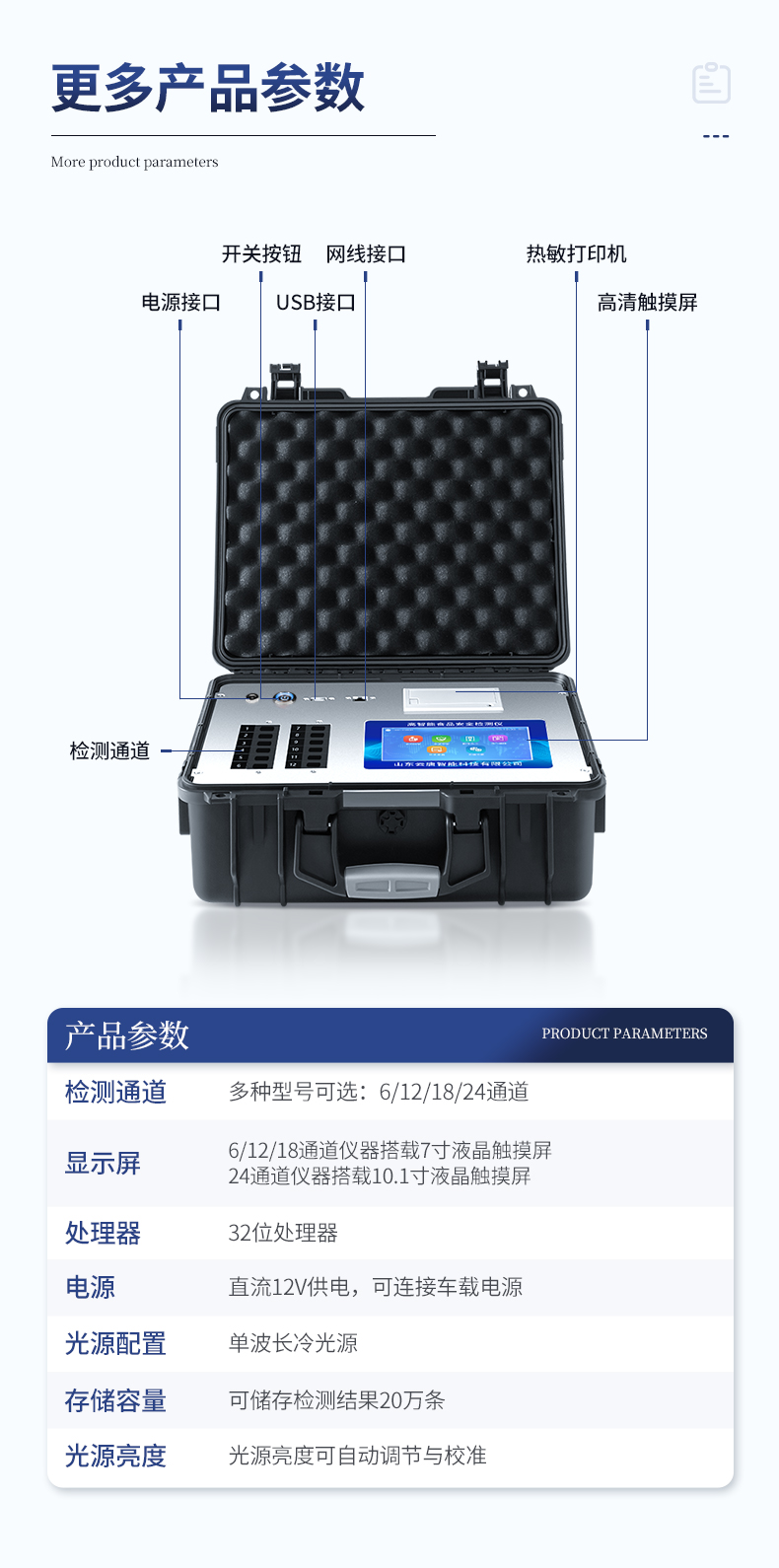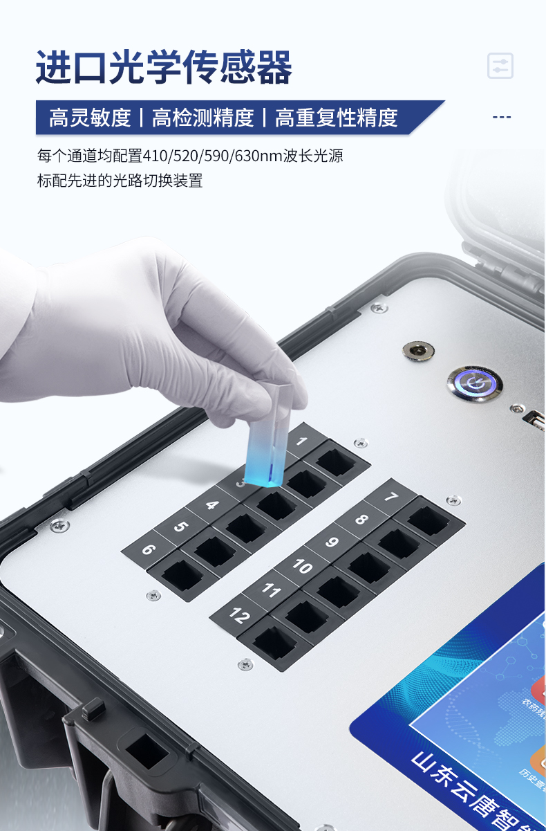 | 1、主控芯片采用ARM Cortex-A7,RK3288/4核處理器,主頻1.88Ghz,運轉速度更快速,穩定性更強。 | 2、顯示方式:7英寸液晶觸摸屏顯示,人性化中文操作界面,讀數直觀、簡單。 | 3、交直流兩用,直流12V供電,可連接車載電源,可配6ah大容量充電鋰電池,方便戶外流動測試。 | 4、四波長冷光源,12個檢測通道,每個通道均配置410、520、590、630nm波長光源,標配**的光路切換裝置,專業光路切換功能可實現*多64波長,并且所有檢測項目可實現所有通道同時檢測。 | 5、智能恒流穩壓,光強自動調節與校準,長時間連續工作光源無溫漂現象。 | ★6、內置新國家限量標準,與所測結果進行現場比對,并持續更新標準。 | 7、不間斷進樣,連續檢測 | 8、樣本編號自動累加。 | 9、數據無線上傳平臺,并可從平臺導出為Excel表格。 | 10、檢測結果存儲容量20萬條。 | ★11、同時支持U盤拷貝,標準USB接口,免驅動插拔。 | 12、檢測項目可擴充,固件可升級 | 13、儀器尺寸:430*343*188mm, 主機凈重:5.1kg | 14、儀器包裝尺寸:510*390*375mm 包裝重量:8.5kg |