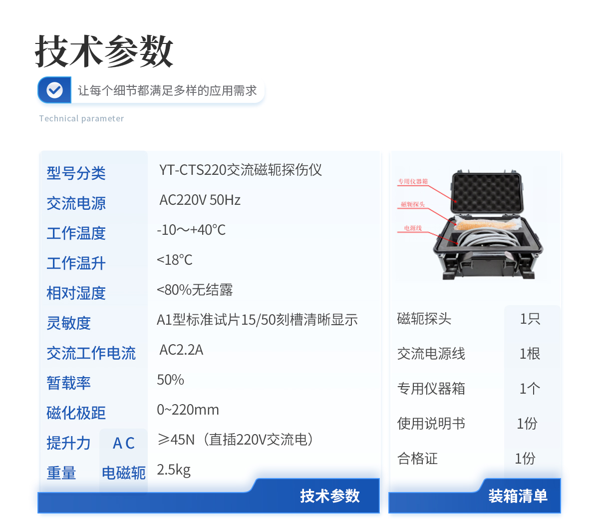 | 型 號(hào) 分 類(lèi):YT-CTS-N型電磁軛探傷儀 | 交流電源:AC220V 50Hz | 工作溫度:-10~+40℃ | 工作溫升:<18℃ | 相對(duì)濕度:<80%無(wú)結(jié)露 | 靈敏度:A1型標(biāo)準(zhǔn)試片15/50刻槽清晰顯示 | 工作電流:AC2.2A | 充電電源:110-240V | 充電時(shí)間:約6小時(shí) | 電池使用時(shí)間:4h/6h(AC) | 暫載率:50% | 磁 化 極 距:0~220mm | 提升力:A C ≥45N(連接交流鋰電池) |