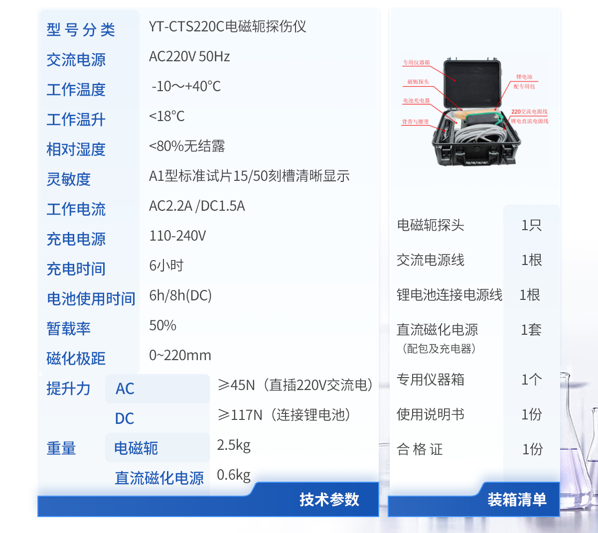 | 1.電磁軛探頭 1 只 | 2.鋰電池連接電源線(xiàn) 1 根 | 3.逆變交流磁化電源(配包及充電器) 1 套 | 4.專(zhuān)用儀器箱 1 個(gè) | 5.使用說(shuō)明書(shū) 1 份 | 6.合 格 證 1 份 |