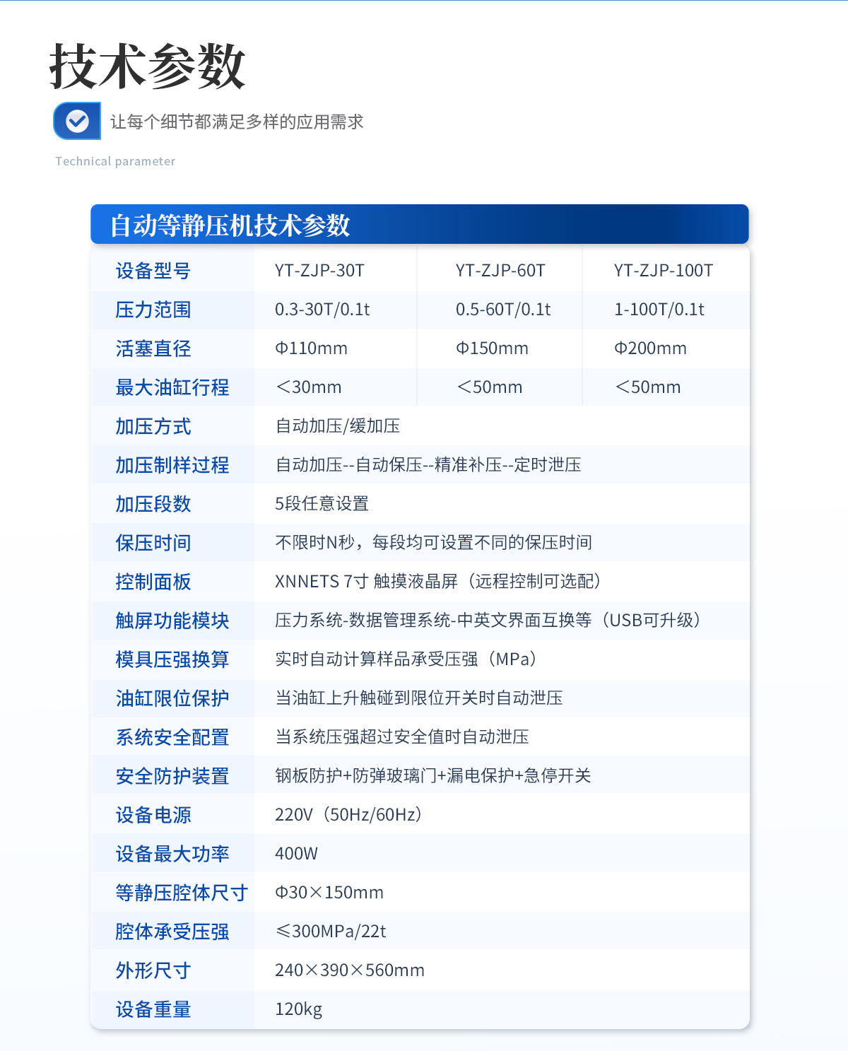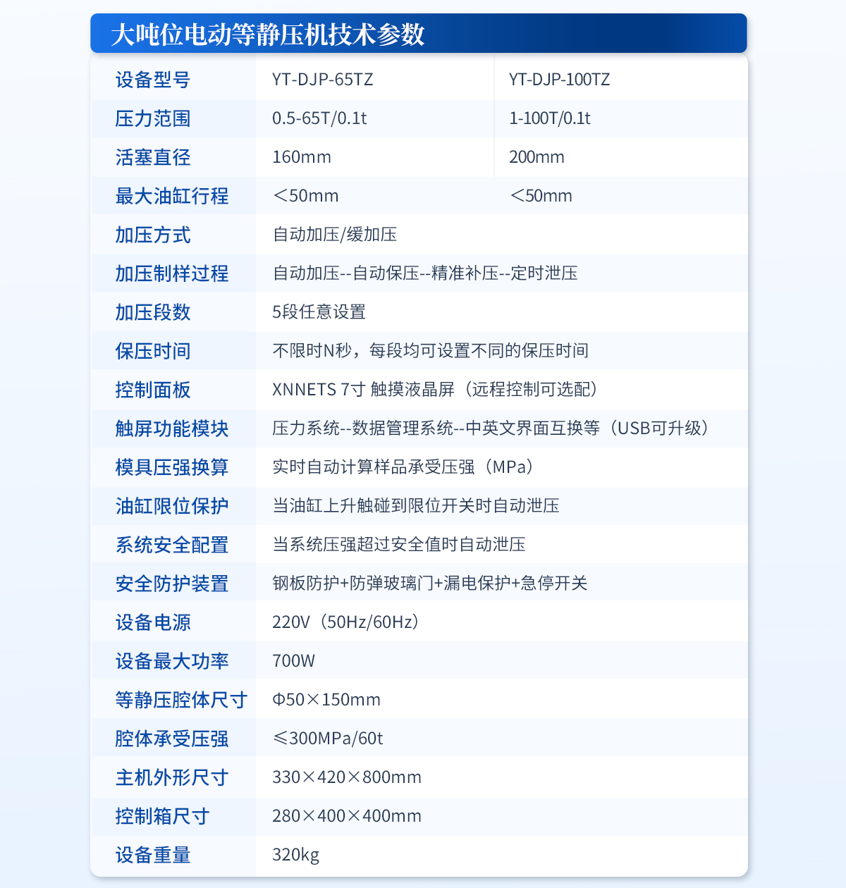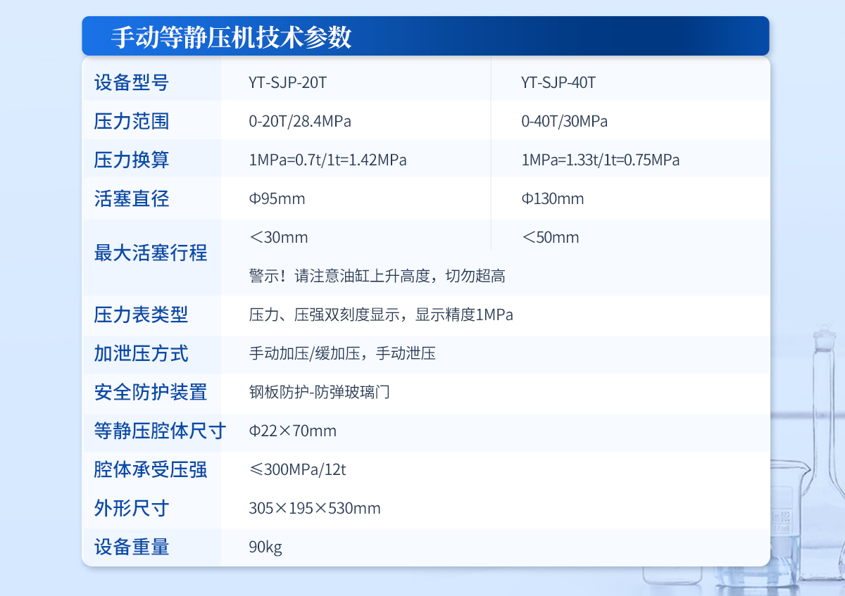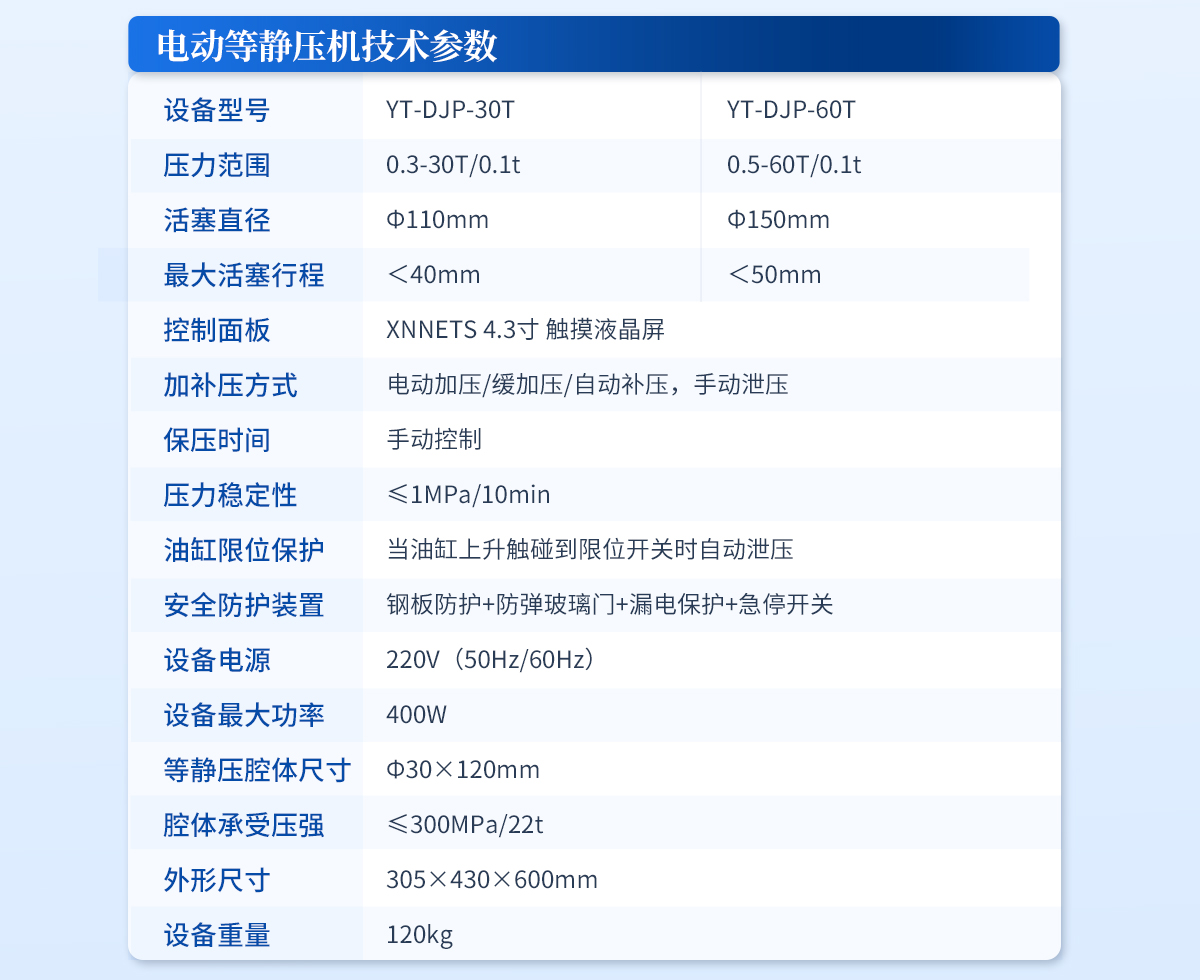 | 規格型號:YT-ZJP-60T | 壓力范圍:0.5-60T/0.1t | 活塞直徑 :Φ150mm | **油缸行程:<50mm | 加壓方式:自動加壓/緩加壓 | 加壓制樣過程:自動加壓--自動保壓--精準補壓--定時泄壓 | 加壓段數:5段任意設置 | 保壓時間 :不限時N秒,每段均可設置不同的保壓時間 | 控制面板:XNNETS 7寸 觸摸液晶屏(遠程控制可選配) | 觸屏功能模塊: 壓力系-統-數據管理系統--中英文界面互換等(USB可升級) | 模具壓強換算:實時自動計算樣品承受壓強(MPa) | 油缸限位保護:當油缸上升觸碰到限位開關時自動泄壓 | 系統安全配置:當系統壓強超過安全值時自動泄壓 | 安全防護裝置:鋼板防護+防彈玻璃門+漏電保護+急停開關 | 設備電源:220V(50Hz/60Hz) | 設備**功率:400W | 等靜壓腔體尺寸:Φ50×150mm | 腔體承受壓強:≤300MPa/60t | 外形尺寸:300×500×680mm | 設備重量:240kg | 配置說明:等靜壓機1臺!可根據需求定制500MPa等靜壓機或橡膠模具 |