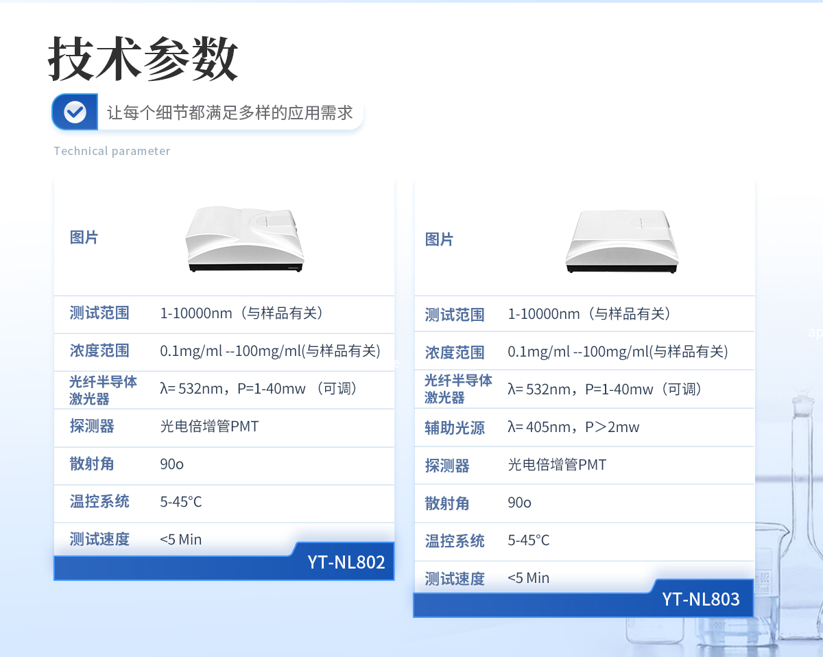 | 規格型號:YT-NL802 | 執行標準:GB/T 19627-2005/ISO 13321-1996 GB/T 29022-2012/ISO 22412-2008 | 測試范圍 :1-10000nm(與樣品有關) | 濃度范圍:0.1mg/ml--100mg/ml(與樣品有關) | 準確度誤差:<1%(國家標準樣品D50值) | 重復性誤差:<1%(國家標準樣品D50值) | 激光光源:光纖半導體激光器,λ= 532nm,P=1-40mw (可調) | 探測器:光電倍增管PMT | 散射角:90o | 樣品池體積:10mm*10mm*40mm, 1--4mL | 溫控范圍:5-45℃ | 溫控精度:0.1℃ | 測試速度:<5 Min |