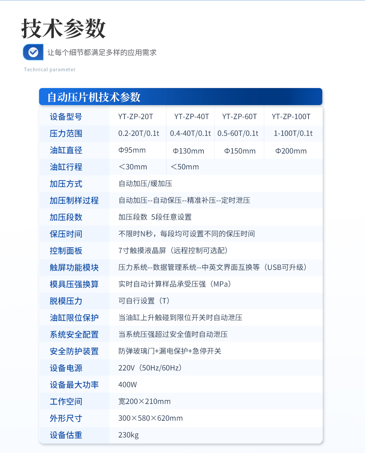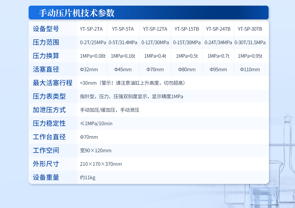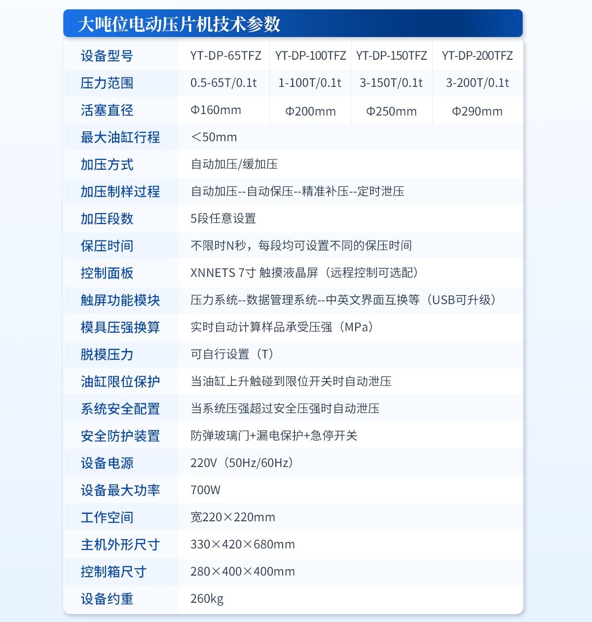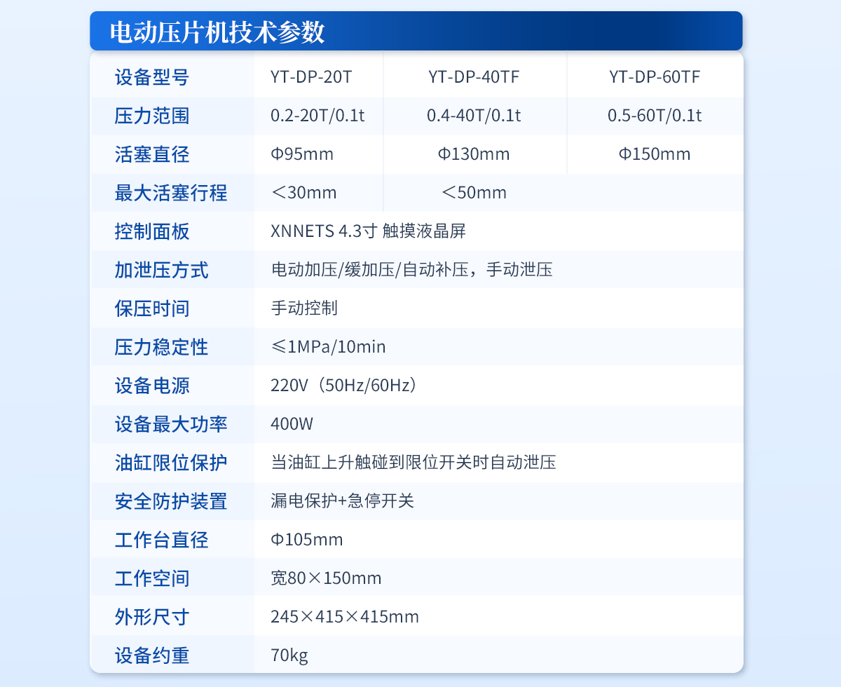 | 設備型號:YT-DP-65TFZ | 壓力范圍:0.5-65T/0.1t | 油缸直徑:Φ160mm | 油缸行程 :<50mm | 加壓方式:自動加壓/緩加壓 | 加壓制樣過程:自動加壓--自動保壓--精準補壓--定時泄壓 | 加壓段數(shù):5段任意設置 | 保壓時間:不限時N秒,每段均可設置不同的保壓時間 | 控制面板:XNNETS 7寸 觸摸液晶屏(遠程控制可選配) | 觸屏功能模塊:壓力系統(tǒng)--數(shù)據(jù)管理系統(tǒng)--中英文界面互換等(USB可升級) | 模具壓強換算:實時自動計算樣品承受壓強(MPa) | 脫模壓力:可自行設置(T) | 油缸限位保護:當油缸上升觸碰到限位開關(guān)時自動泄壓 | 系統(tǒng)安全配置:當系統(tǒng)壓強超過安全值時自動泄壓 | 安全防護裝置:防彈玻璃門+漏電保護+急停開關(guān) | 設備電源:220V(50Hz/60Hz) | 設備**功率:700W | 工作空間:寬220×220mm | 主機外形尺寸:330×420×680mm | 控制箱尺寸:280×400×400mm | 設備約重 :260kg | 配置說明:主機1臺,控制箱1臺!模具選配!可根據(jù)需求定制壓片機或模具 |