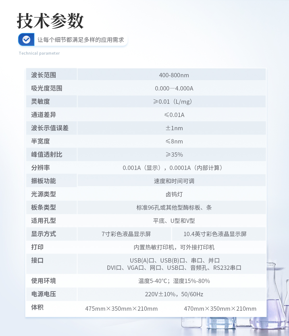| 系統:7英寸彩色觸摸屏,安卓系統 | 讀數范圍 :0-4.000Abs | 濾光片帶寬:8~10nm | 分辨率:0.001Abs | 波長范圍:340-750nm覆蓋整個可見光波長 | 線性范圍:0~3.0Abs,士1%; 3~4.0Abs, 土2% (@405nm) | 準確性:士1% (0-3Abs) 士2% (3- 4Abs) (@405nm) | **性:CV≤0.2%(0-3Abs) CV≤1.0%(3- 4Abs)標準測量模式 (@405nm) | 濾光片:8片濾光片輪,標配4塊濾光片; 405nm,450nm,492nm,630nm,另可選; 配340nm-750nm波長濾光片 | 測量速度: (<6S, 96孔板整板檢測,快速測量模式;單波長<15s/96孔,雙波長<28s/96孔(標準測量模式) | 內存:可存儲200個測量程序和10萬個測結果(96孔板) | 接口:3個USB接口,分別用于連接電腦,打印機和U盤掃碼槍 | 光源:6V10W鹵素燈,壽命可達2000h | 外形尺寸:W440mm×D295mm×H225mm | 電源:AC100-240V, 50-60Hz, 2A | 凈重:10kg |