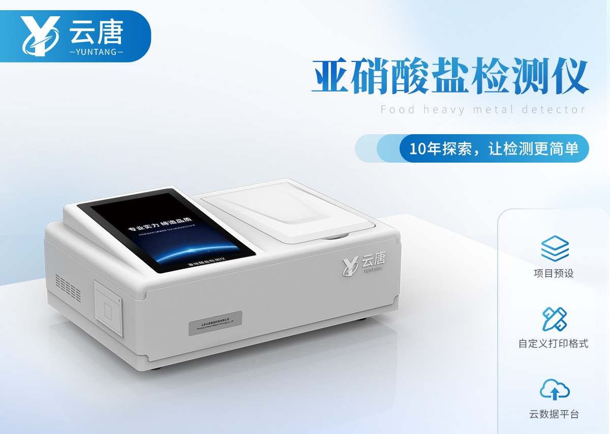 YT-Y12食品中亞硝酸鹽快速檢測儀為集成化食品安全檢測分析設備,能夠快速檢測肉類、肉類罐頭、熏肉、香腸、奶制品、泡菜、腌制蔬菜等中的亞硝酸鹽含量;該儀器是根據GB5009.33-2010《食品中亞硝酸鹽與硝酸鹽的測定》,食品中的亞硝酸鹽經過提取,與檢測試劑反應生成有色化合物,再利用亞硝酸鹽檢測儀測定其吸光度,在一定范圍內吸光度與含量成正比。通過檢測可確定食品是否符合國家標準或是否為超標毒害食品等。儀器預留其他項目檢測程序和端口,根據日后需求可方便的自主增加檢測項目。日后可升級為檢測水產品、面制品的綜合類型儀器。