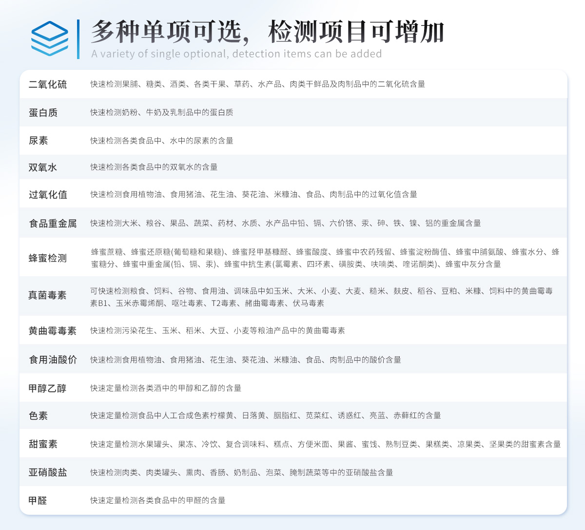 | 儀器采用臺式一體化系統檢測技術,將分光光度模塊、新型農殘檢測模塊、數字化管理模塊、無線通訊模塊高度集成于一體,支持檢測200種食品安全檢測項目,同時預留升級檢測方法。 | 儀器檢測模塊標準化、智能化,可隨意自由組合。檢測箱體內置多個標準檢測單元,檢測模塊可以調整配置。 | 儀器采用全新安卓智能系統,主控芯片采用 ARM Cortex-A7,RK3288/4核處理器,10.1寸高清液晶觸摸豎屏,更加**的UI交互界面,運轉快捷;儀器配備無線通信模塊: 4G(APN)通訊模塊、Wifi模塊,藍牙傳輸,同時具有雙USB接口以及RJ45接口能以多種方式實現數據保存和數據傳輸功能。 | 創新檢測模式: | ★檢測通道:≥12通道;采用精密旋轉比色池設計,使用同芯片同光源校準精度,解決不同光源之間的誤差值。1-12通道間誤差0.1%。(***:**202022821055.2) | ★儀器具有自動識別比色皿檢測功能,即:將樣品比色皿放入儀器后,點擊樣品檢測,儀器自動識別比色皿進行通道檢測。 | 進口高精光源: | 高精度進口四波長冷光源,通道配置 410、520、590、630nm 波長光源,一個光源芯片驅動一個光源,誤差極小,每臺設備單獨**校準光源,**比對,同時參照四種不同波段光源全方位覆蓋市面上99%的農殘食品項目檢測。 | 智能化操作系統: | 便捷操作系統:設備檢測時可在同一檢測界面自動對應相關檢測通道一次性選擇1-12個樣品名稱,無須退出界面,節省操作時間。 | 數據集成系統:設備首頁自動統計檢測數據包含:周檢測數據、月檢測數據,全部檢測總數量,均包含檢測總數,合格數,不合格數,以及相關柱形分析圖,對各項檢測數據清晰掌握,無需電腦查詢,更加快捷直觀。 | 項目預設系統:支持添加單個及多個相同或不相同的任務預設,一鍵快速調取,每一個任務分別可以設置不同的樣品、批次、編號、來源、備注、抽樣信息、檢測信息、受檢信息、復核信息等更多信息。無縫鏈接平臺和APP實時查看下發任務。 | 數據監管系統:同步對接監管平臺,數據可局域網和互聯網數據上傳,檢測結果可選擇直接傳至食品安全監管平臺。集成OSS輸出存儲服務、區分設備定向管理應用,進行區域食品安全監管及大數據分析處理與數據統計,檢測區域食品安全長短期動態,達到食品安全問題預估、預警。 | 自定義打印系統:內置全新打印系統,新創自定義打印方式,可按需靈活設置開啟或關閉:產品合格證(國家農業部標準要求),二維碼,抽樣信息、檢測信息,受檢信息、復核信息、抽樣日期、檢測日期等信息的打印。 | 系統遠程更新功能:可定向分客戶分儀器更新系統,按照不同客戶后期實際需求添加項目,無需機器返廠,即可遠程實時升級全新系統,節省時間成本及避免運輸造成設備損壞。 | 儀器主機采用一體化防水、抗壓、防撞擊、防腐蝕箱體設計,同時配備交直流供電,可連接車載電源,可選配大容量充電鋰電池,滿足現場野外檢測需求。 | 安全證書,放心保障:儀器具有中國計量科學研究院校準證書,權威認證。 |